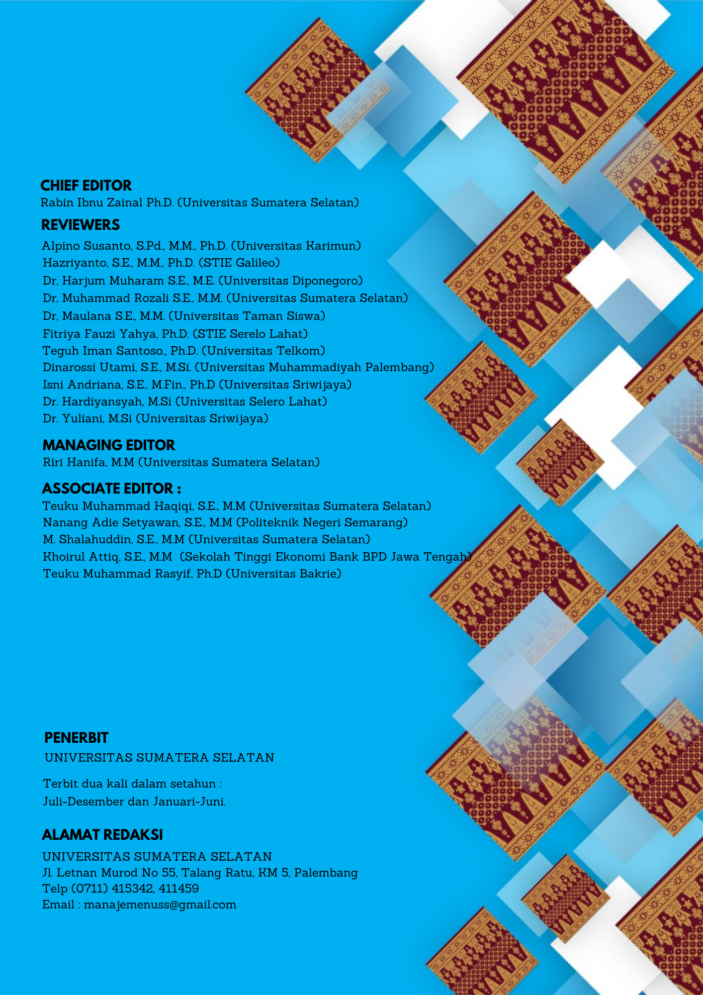 All Articles in this issue were authored/co-authored by 14 authors from (Universitas Sumatera Selatan, Politeknik Negeri Semarang, UIN K.H Abdurahman Wahid Pekalongan dan Universitas Tridinanti Palembang)