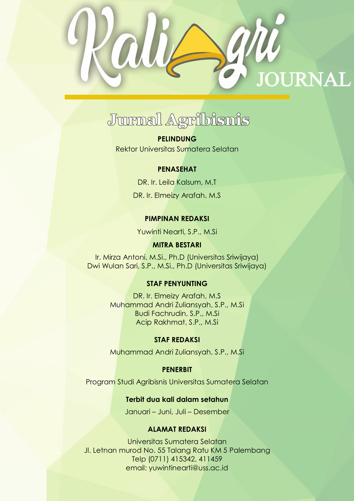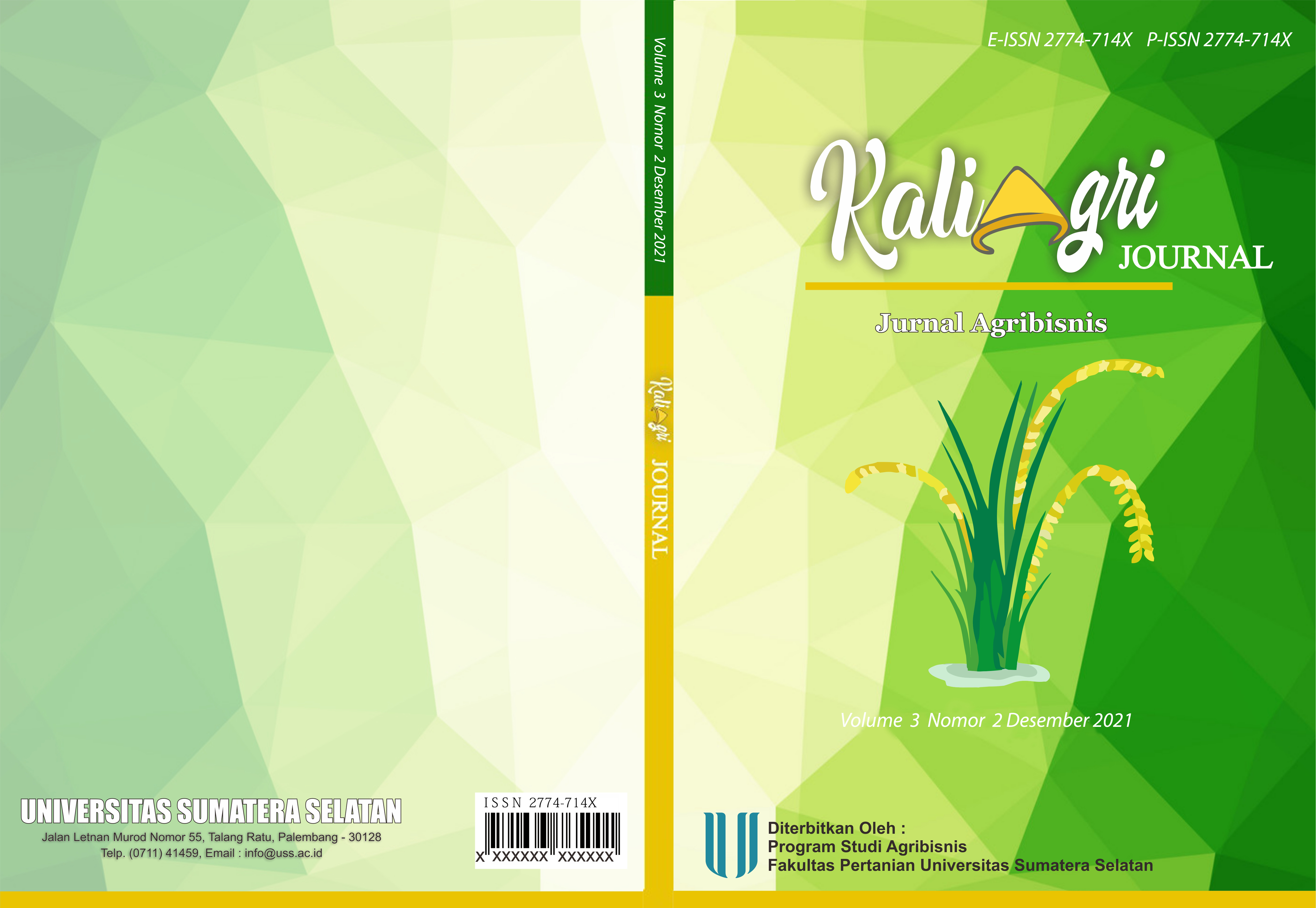 Jurnal KaliAgri merupakan Jurnal yang diterbitkan oleh Program Studi Agribisnis Fakultas Pertanian Universitas Sumatera Selatan. Kami mengucapkan terima kasih kepada BPTP Jawa Tengah dan BPTP Sumatera Selatan serta Universitas SJahkhyakirti Palembang yang telah mempercayai untuk dipublikasikan pada jurnal KaliAgri volume 3 Desember 2021.