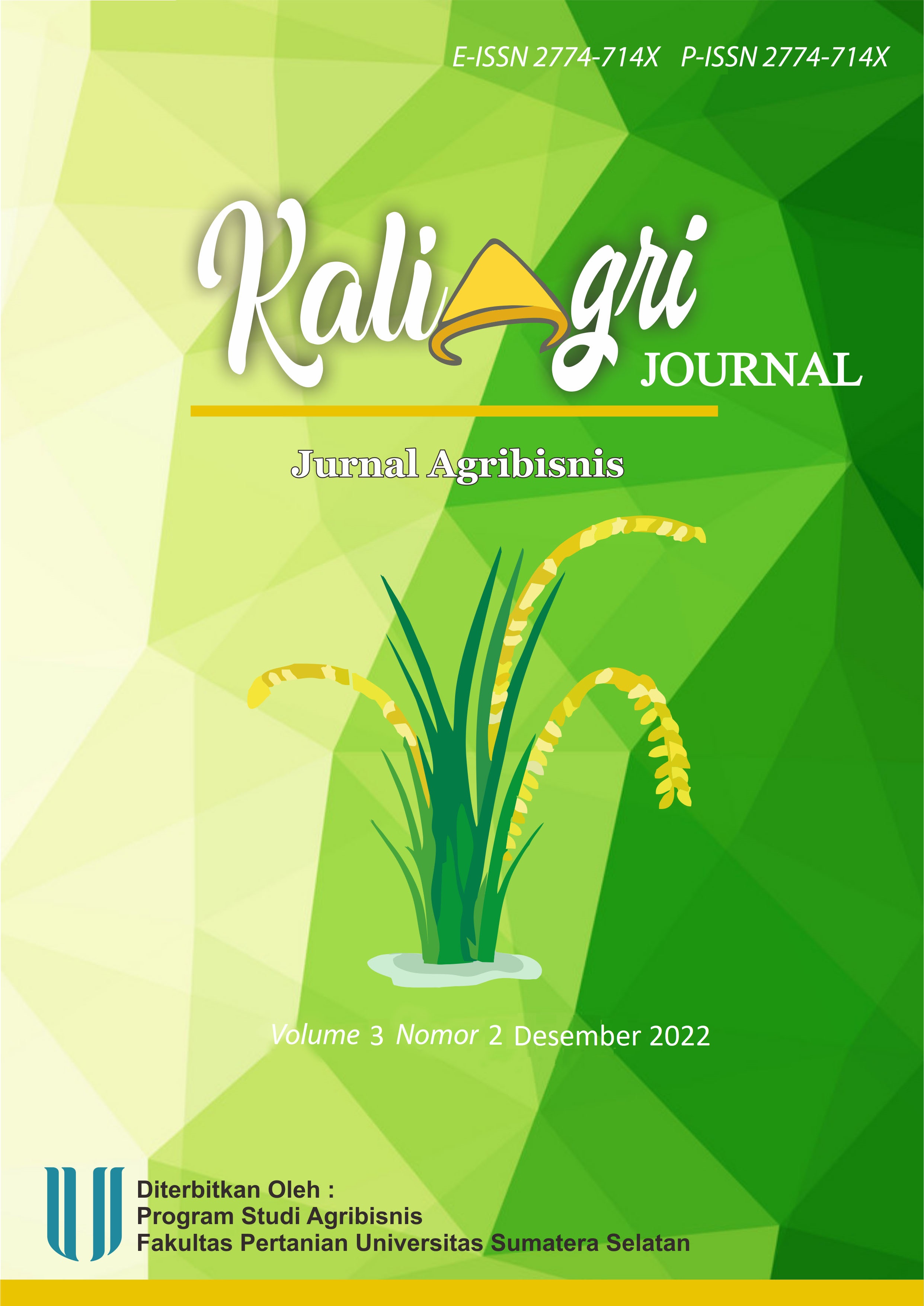 Jurnal KaliAgri merupakan Jurnal yang diterbitkan oleh Program Studi Agribisnis Fakultas Pertanian Universitas Sumatera Selatan. Kami mengucapkan terima kasih kepada para peneliti yang telah mempercayai penelitiannya untuk dipublikasikan di Jurnal KaliAgri Volume 3 No 2 Desember 2022.